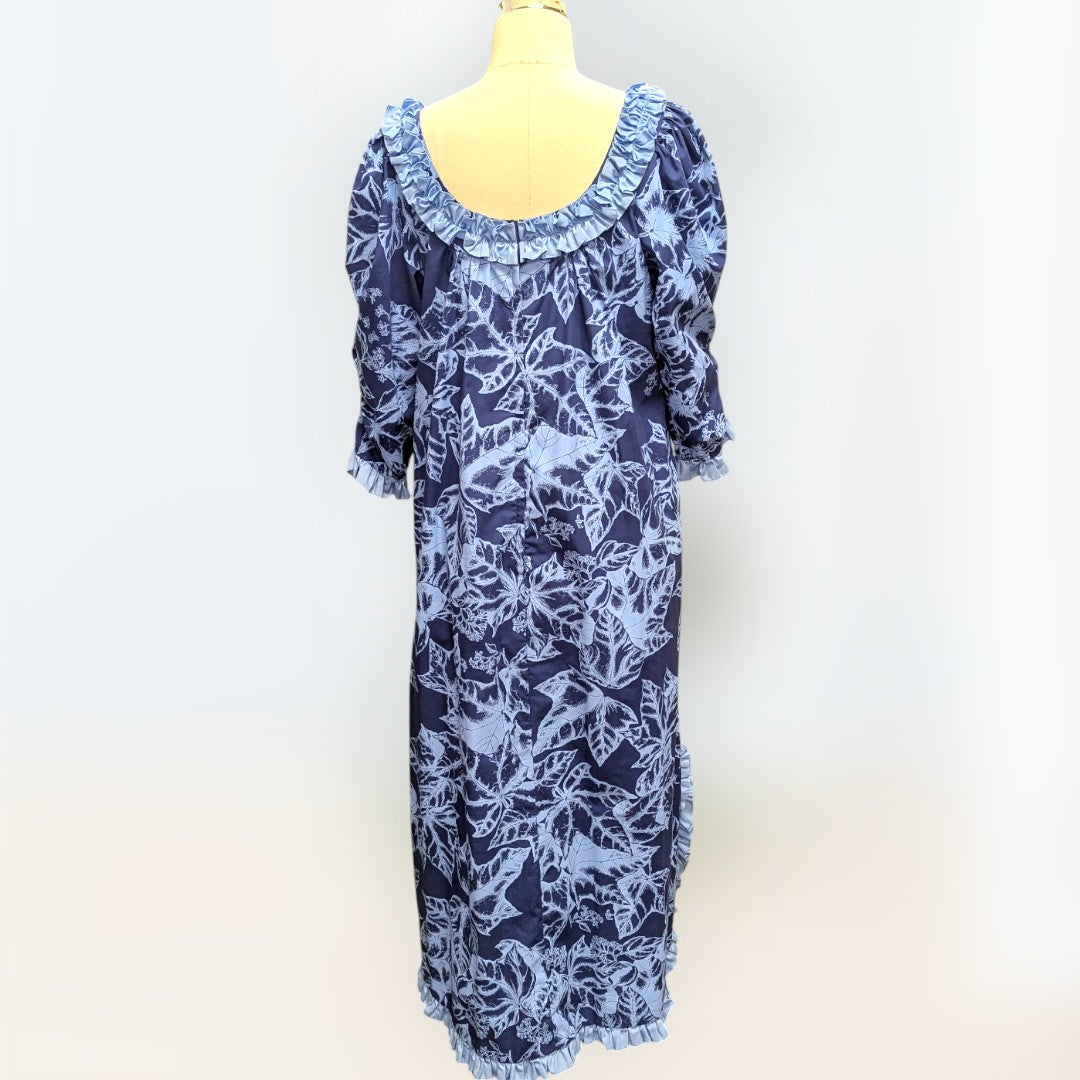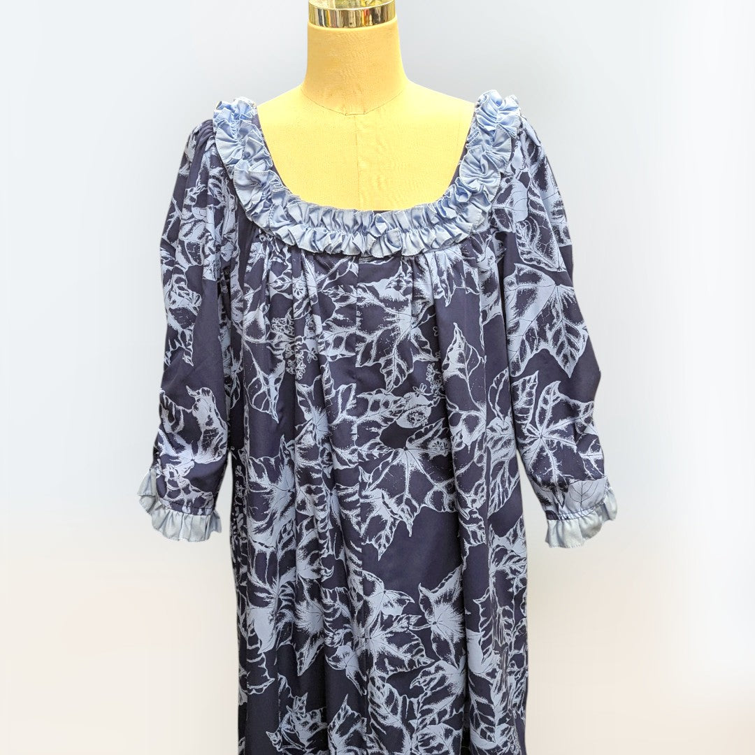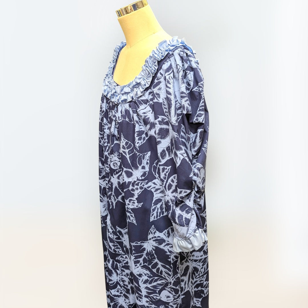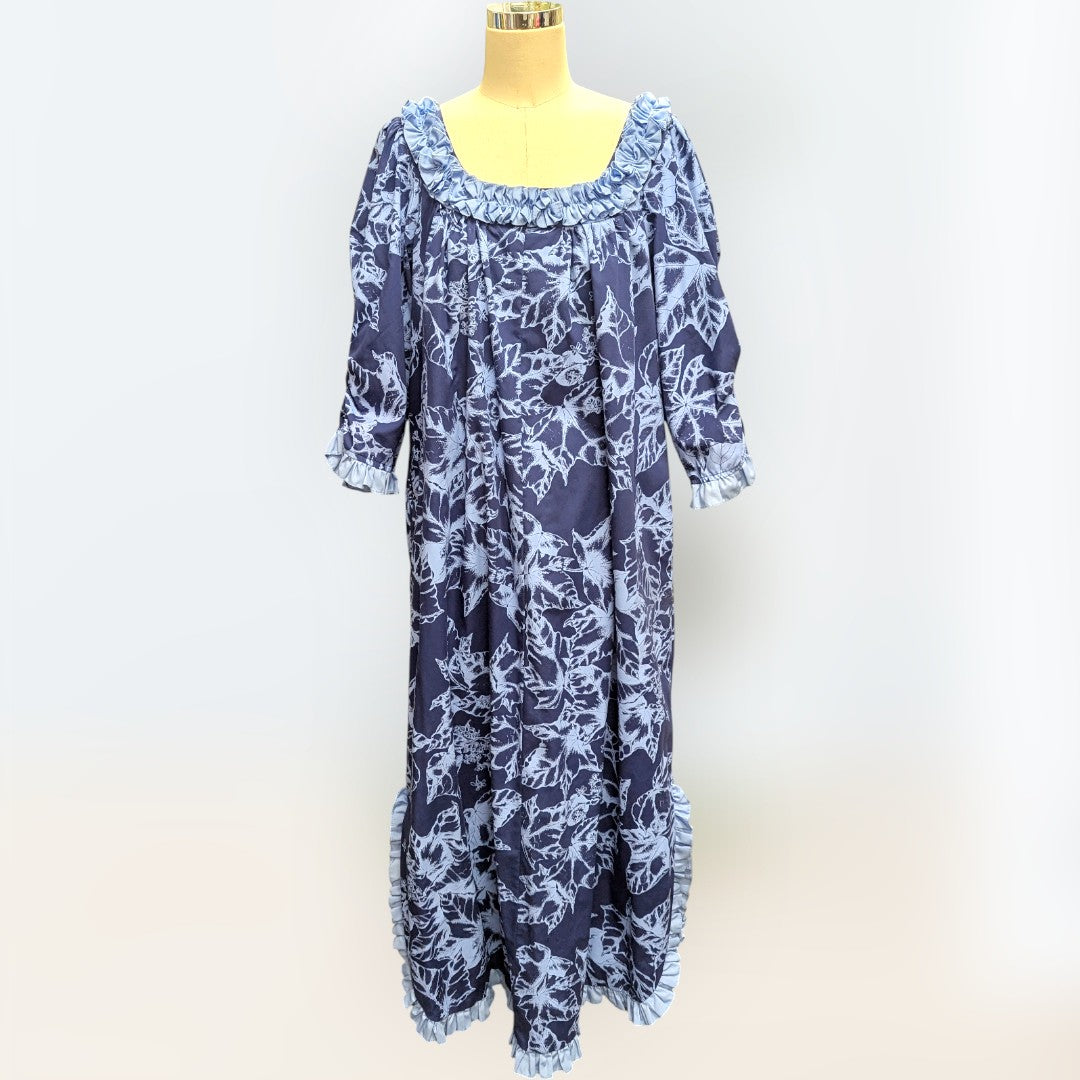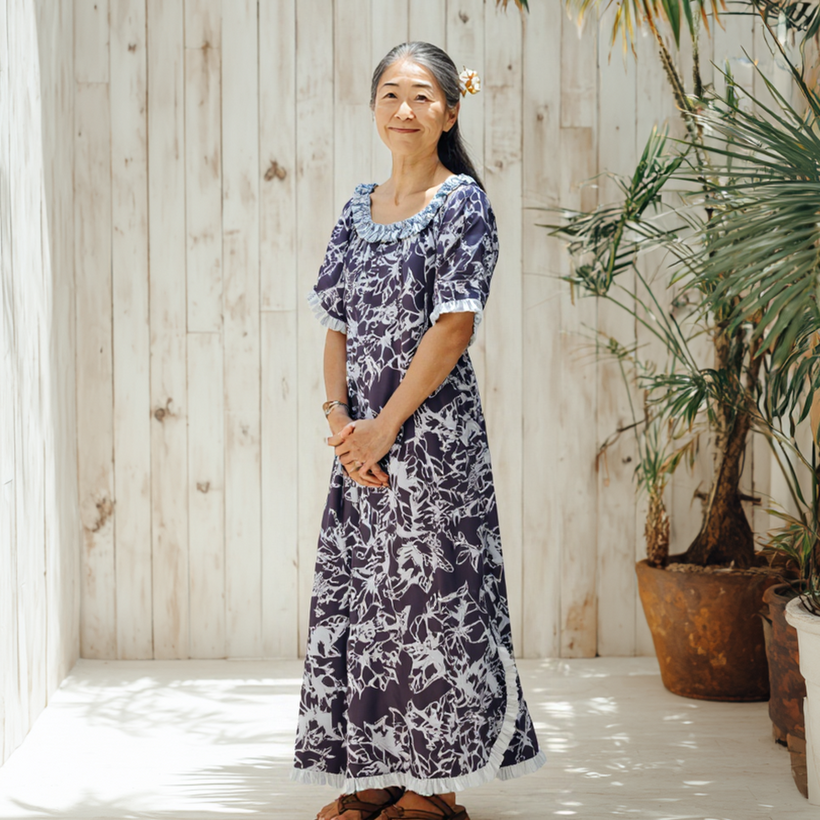 落ち着いたネイビーカラーで仕立てた、ゆったりシルエットのムームードレス。上品で安心感のある色合いは、幅広い年代の方に人気のデザインです。