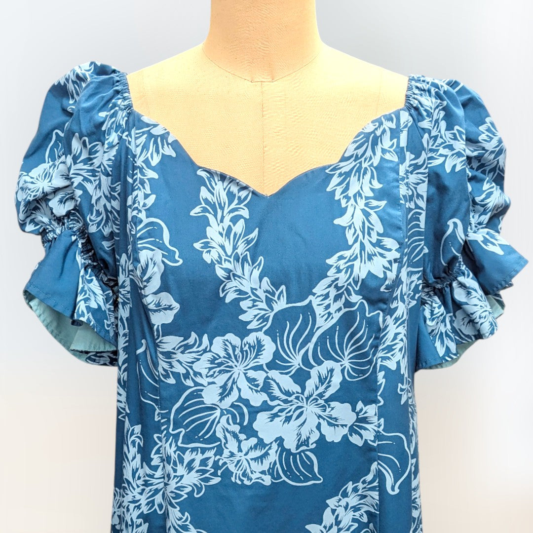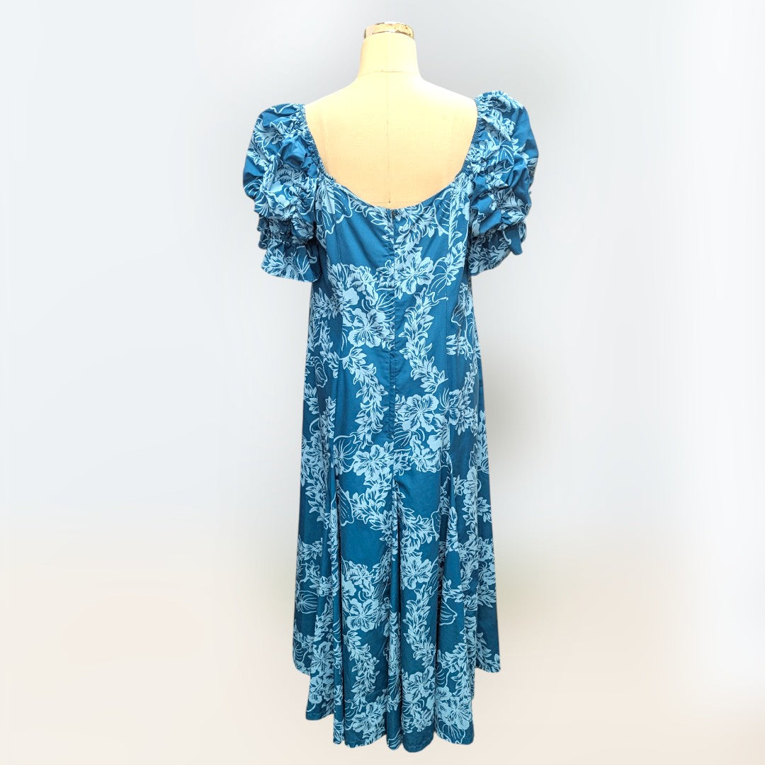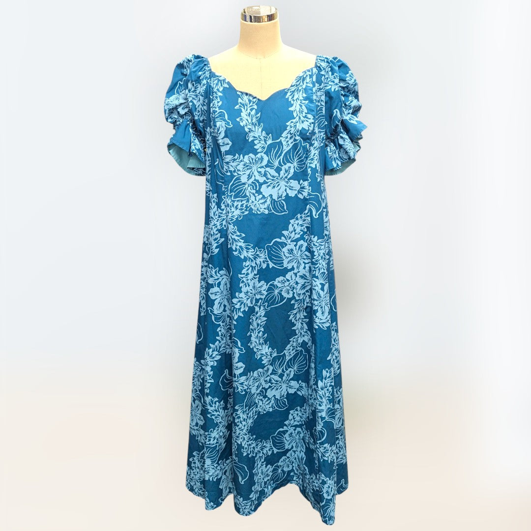 鮮やかなエメラルドグリーンにチューベローズ柄をあしらった、〈プリンセス カイウラニ〉特注のムームードレス。
