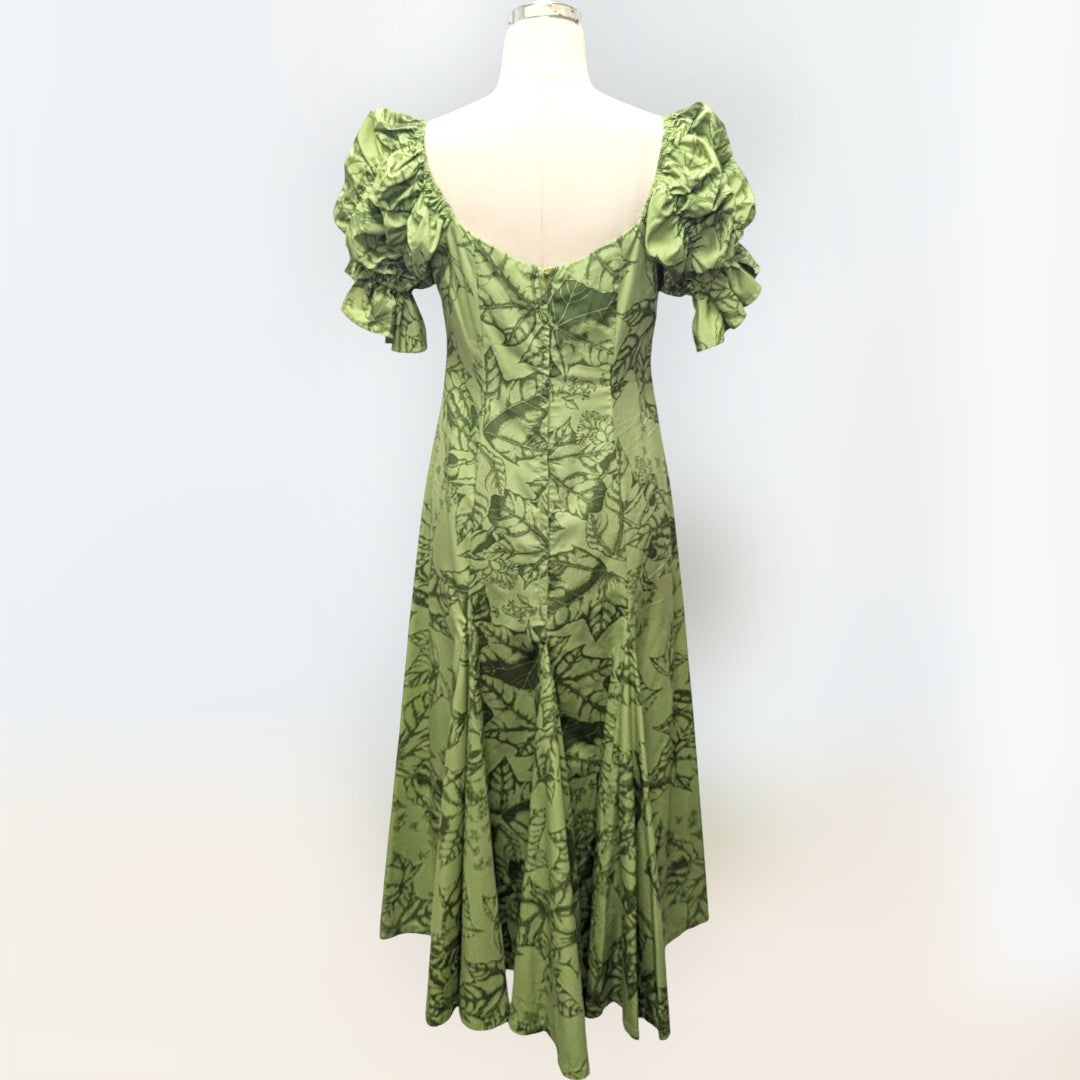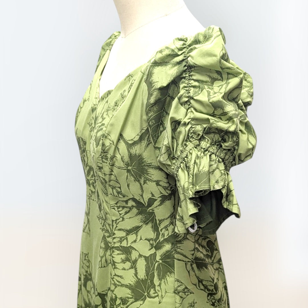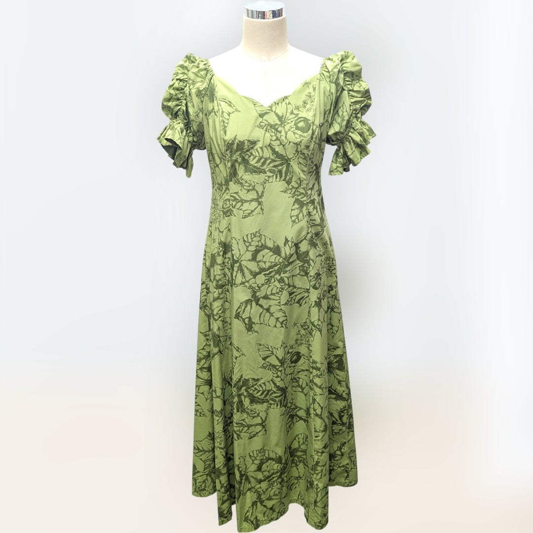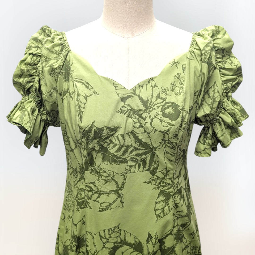 深みのあるシトロンカラー(ダークグリーン)にククイ柄をあしらった、〈プリンセス カイウラニ〉特注の半袖ムームードレス。
