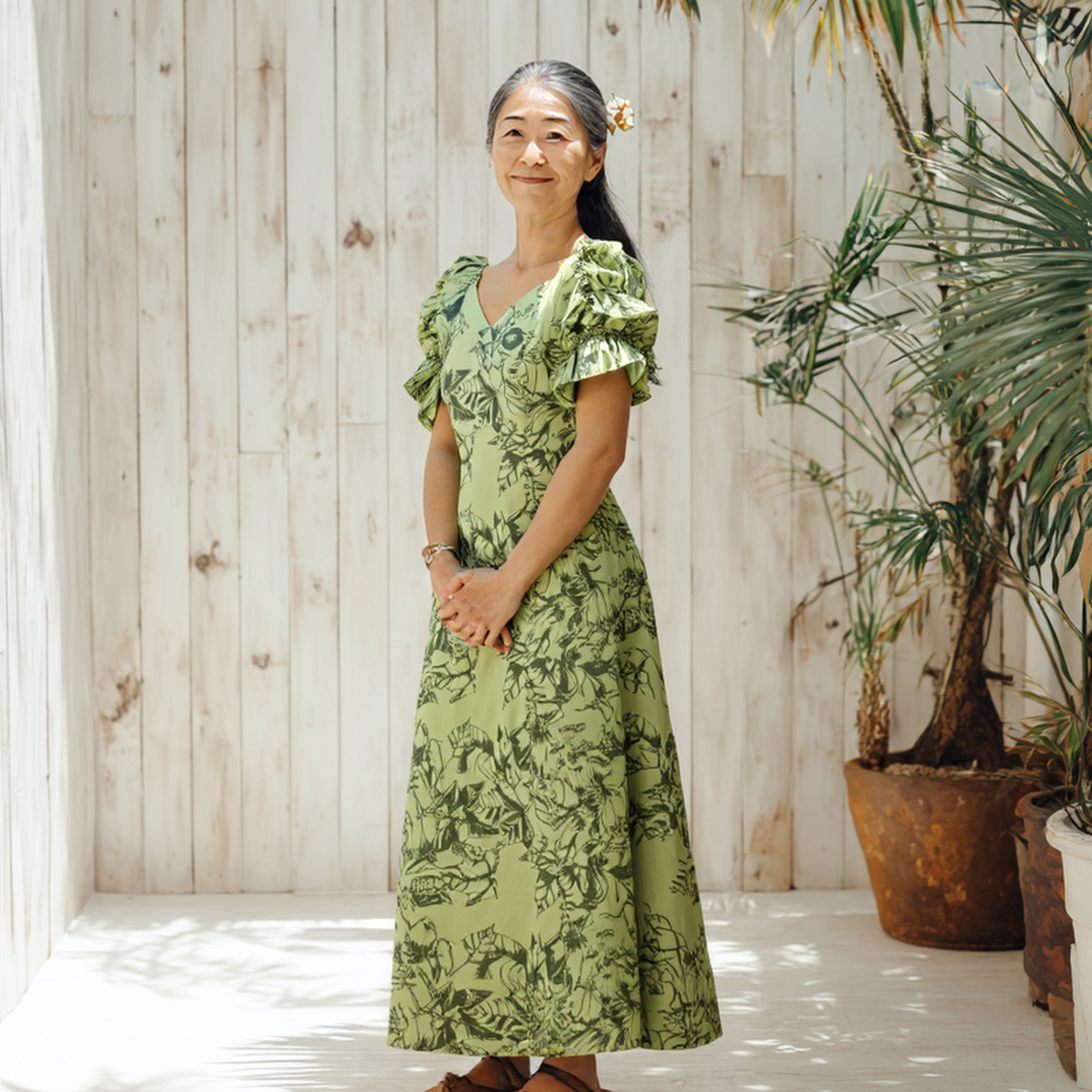 ハワイの老舗ブランドならではの気品あふれるデザインで、挙式参列や特別な日の装いにもふさわしい上質な一着です。
