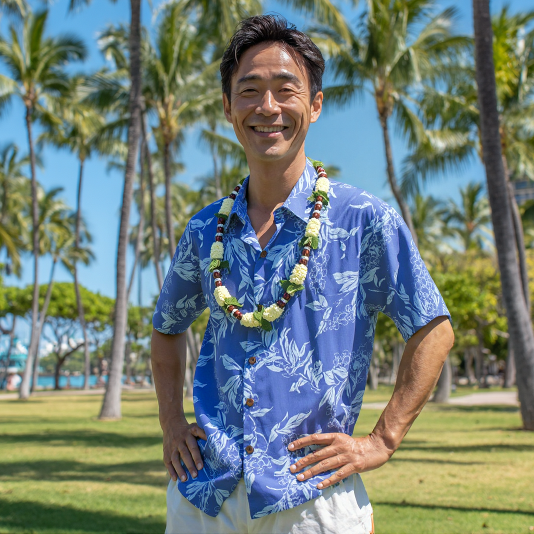 シャツの柄のマイリレイはお祝いの時などにふさわしい葉のみの柄でシンプルですっきりした柄が人気です。