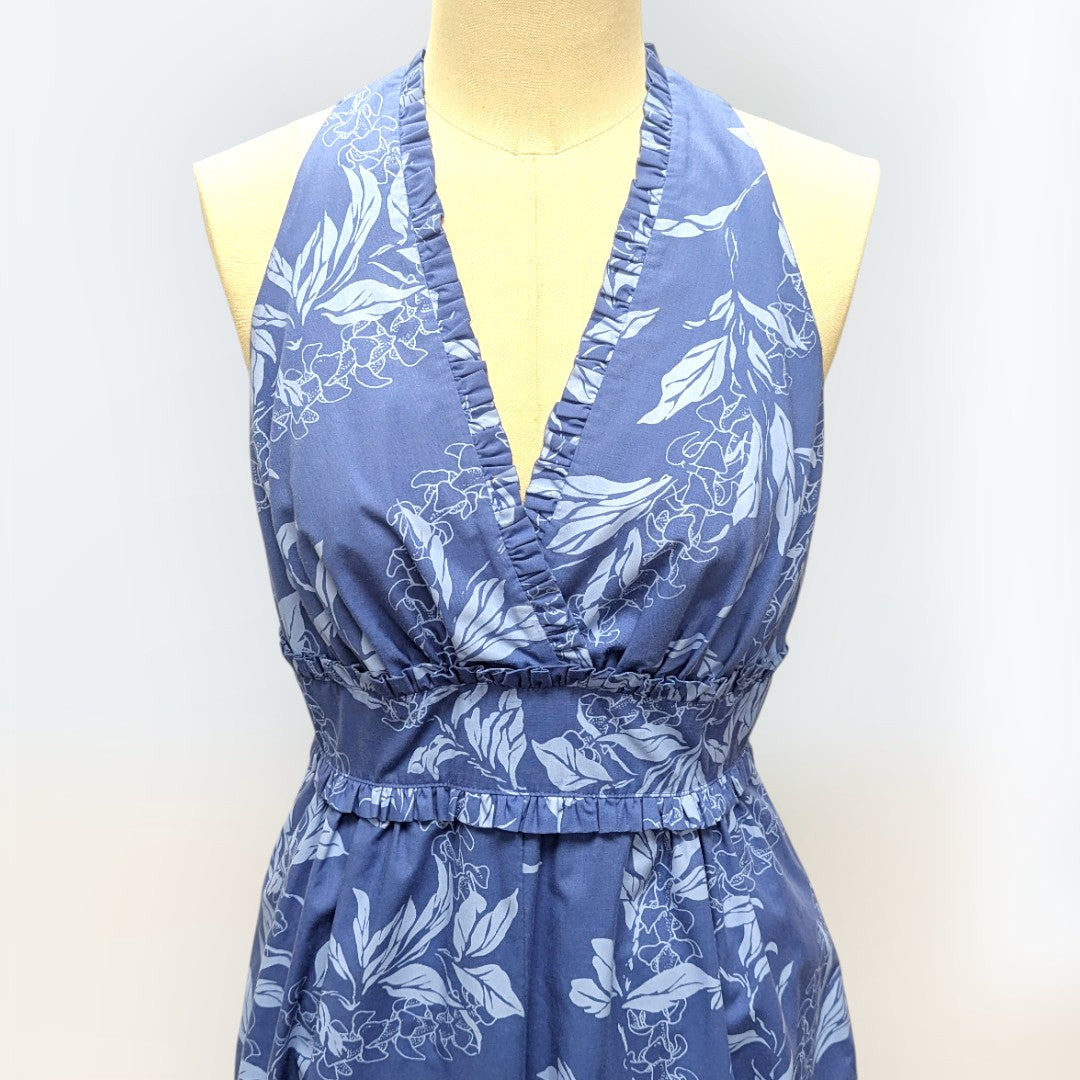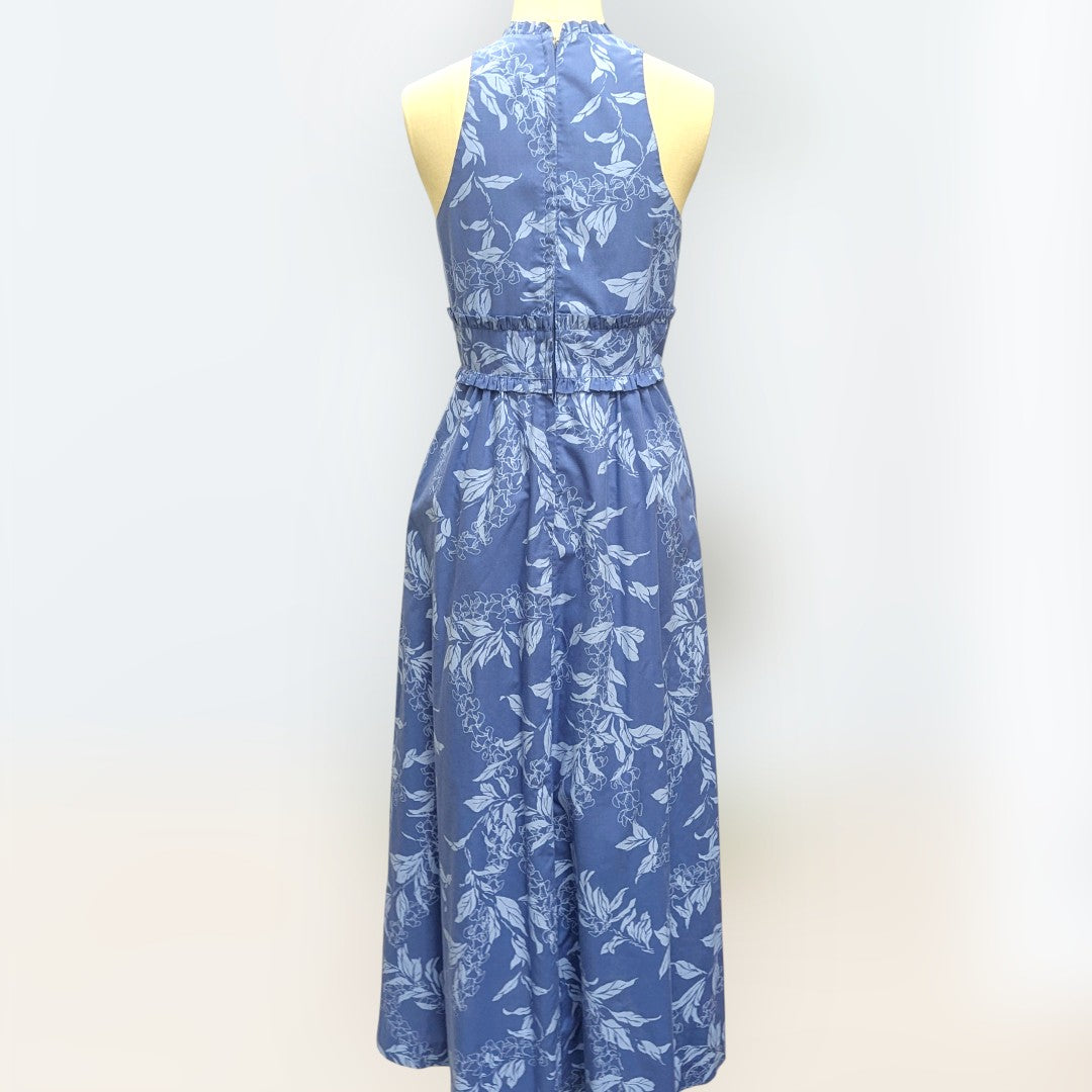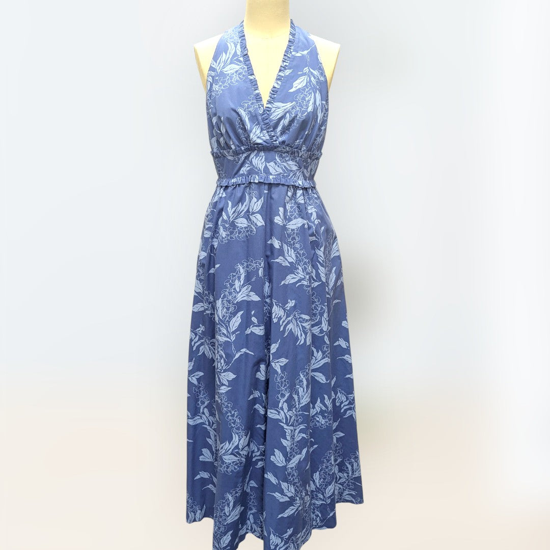鮮やかなブルーにマイリ柄をあしらった、〈プリンセス カイウラニ〉のタンクドレス。
