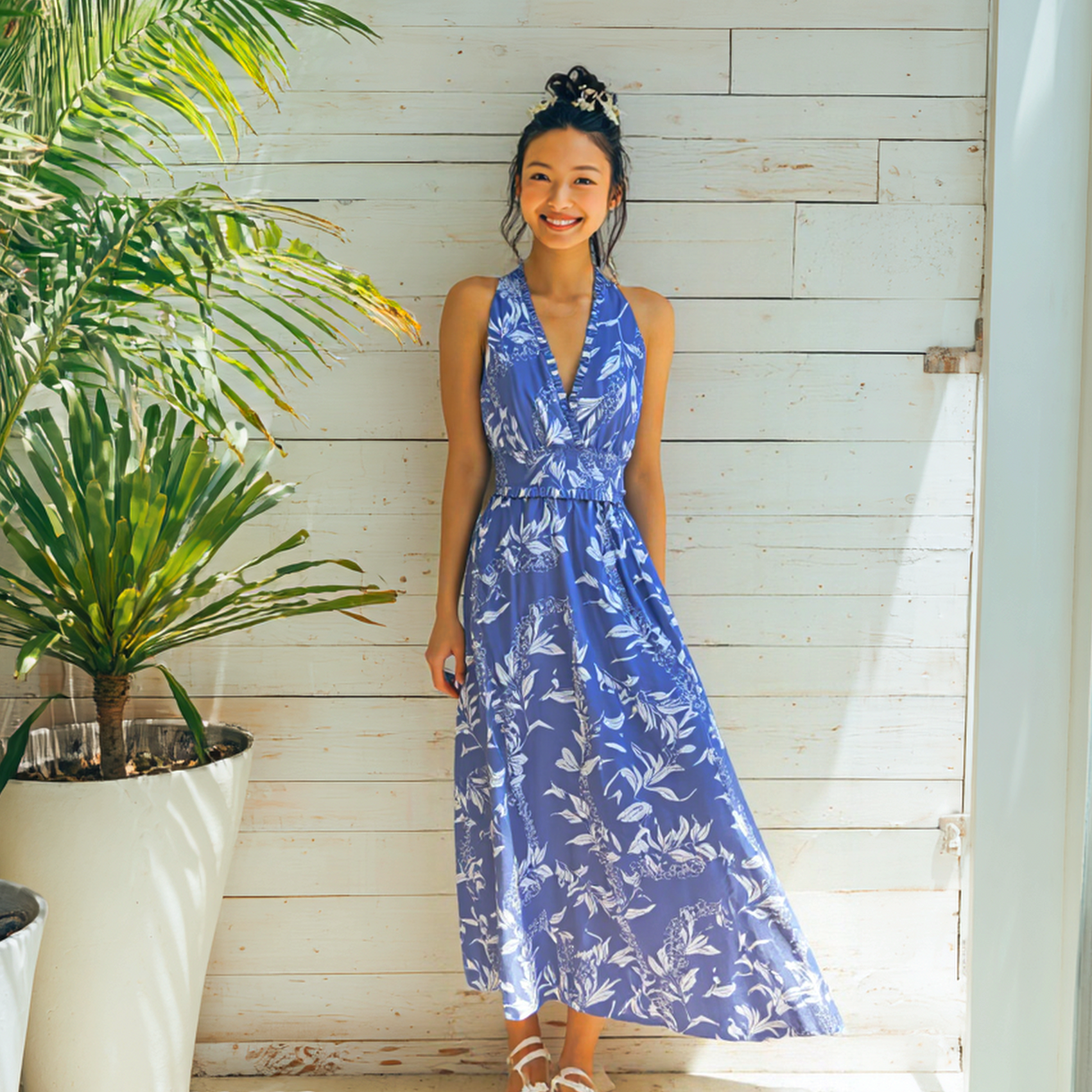 リゾートでもフォーマルでも映える、万能なブルードレスです。