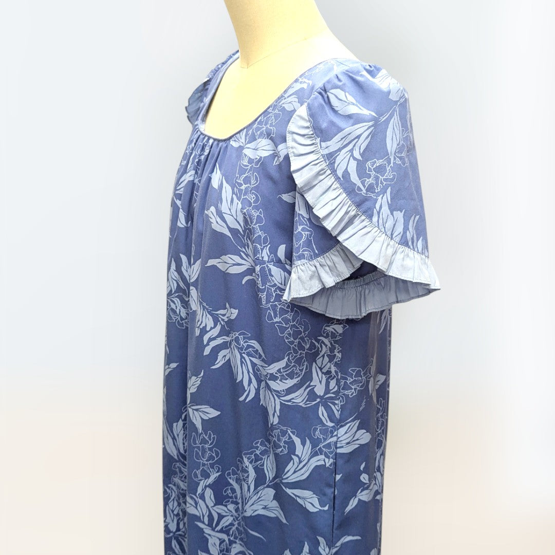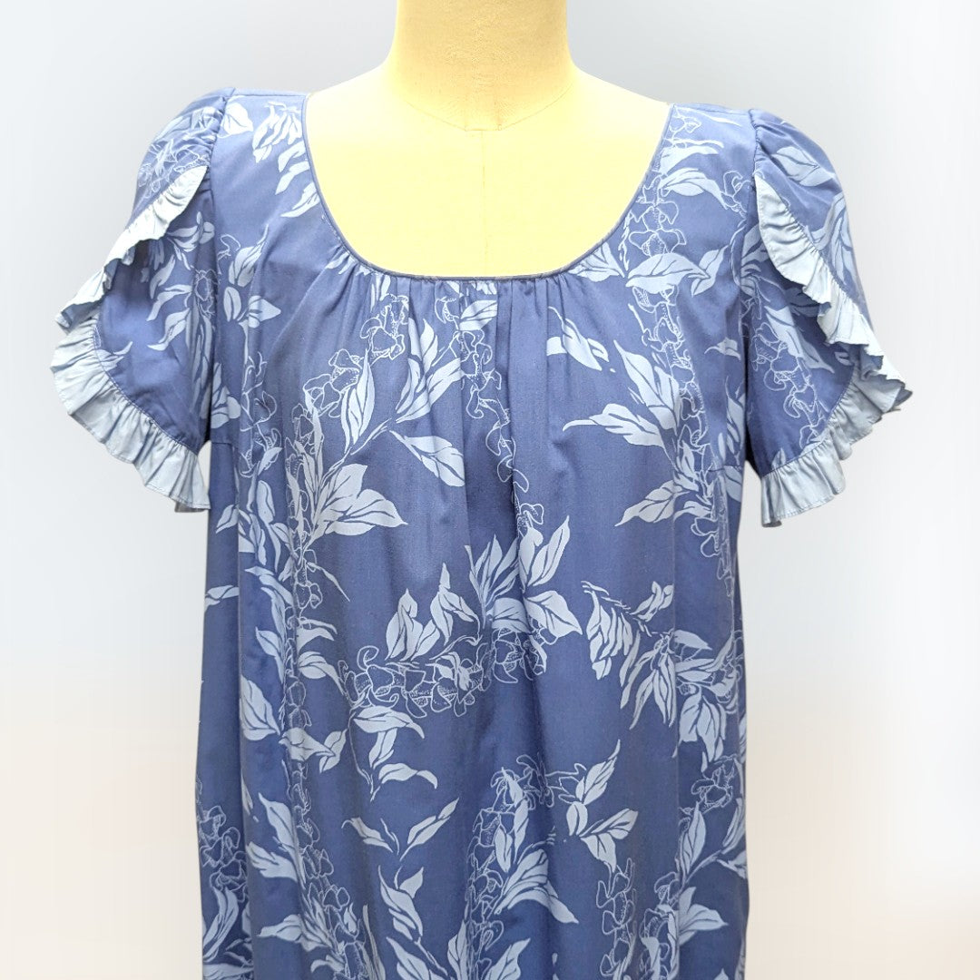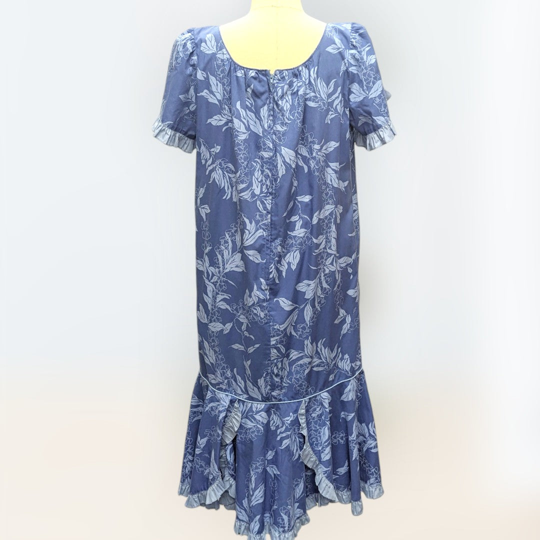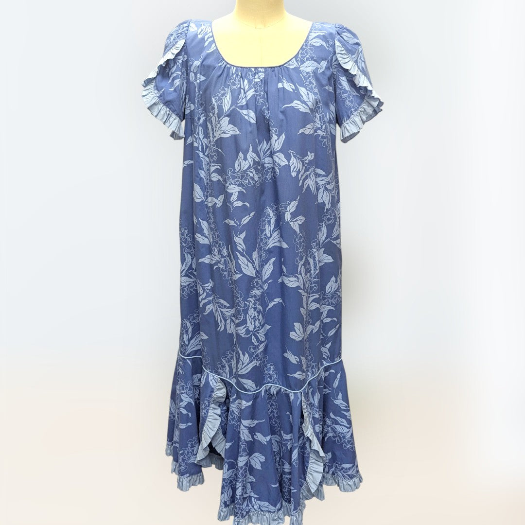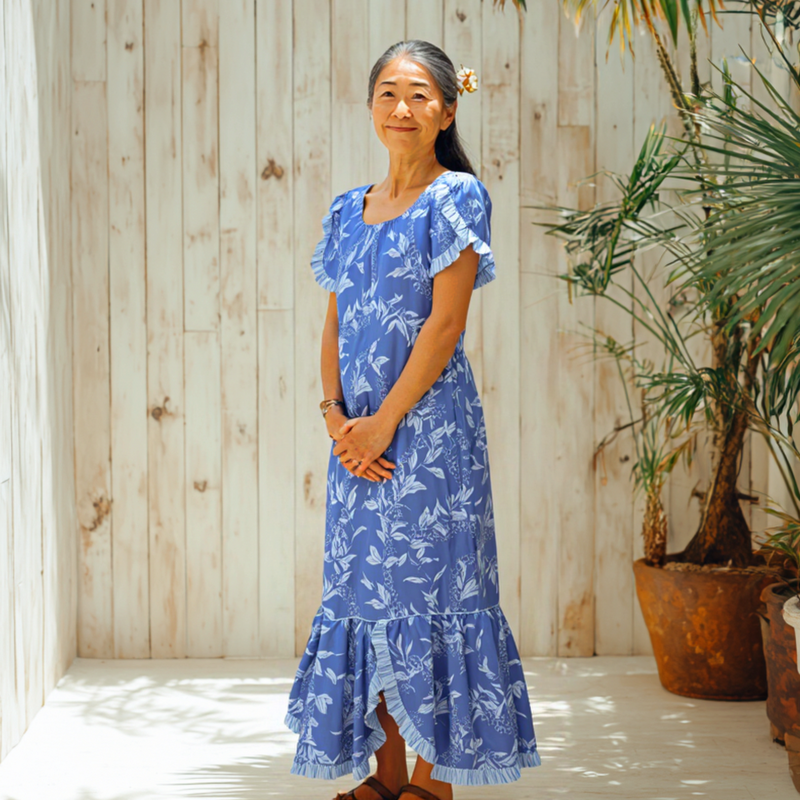 深みのあるブルーにマイリ(Maile)柄をあしらった、〈プリンセス カイウラニ〉のムームードレス。