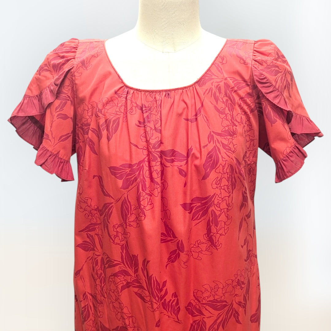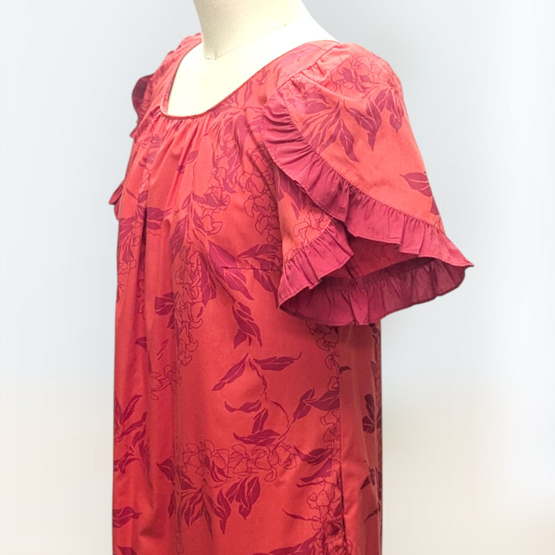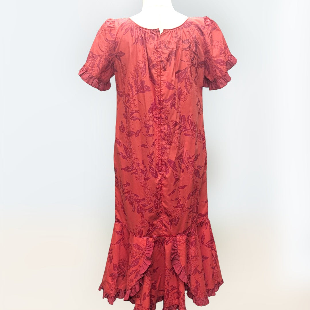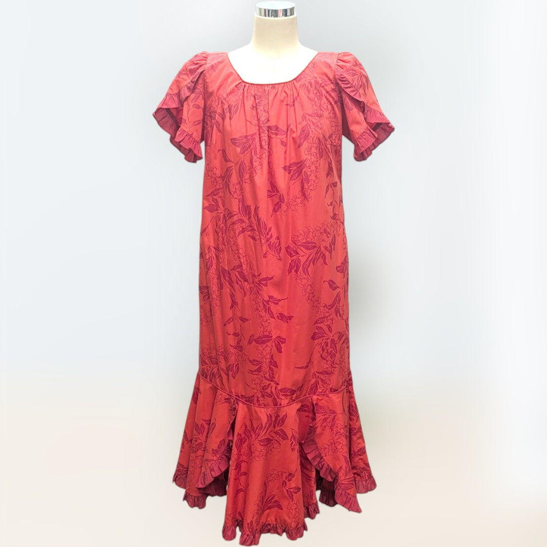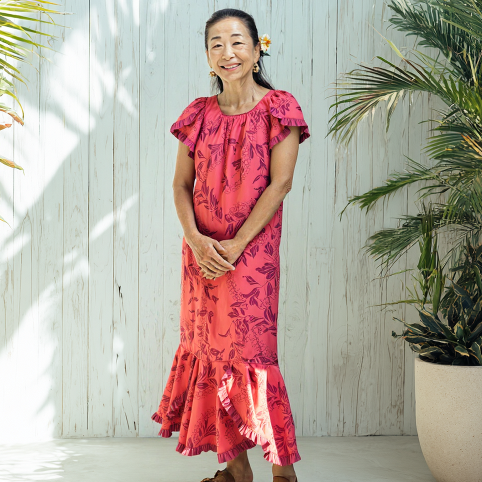 深みのあるレッドにマイリ(Maile)柄をあしらった、〈プリンセス カイウラニ〉のムームードレス。